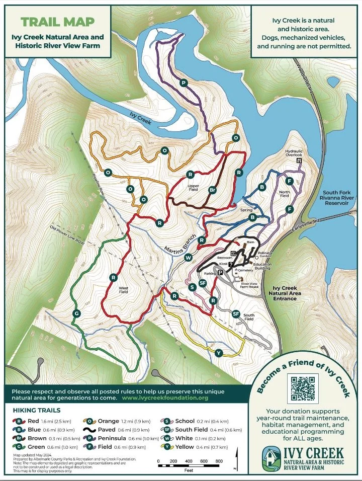 Scenically shadowed by the Blue Ridge Mountains, this 219-acre preserve bordering the South Fork Rivanna Reservoir is a mix of upland woods, pine stands, open fields, streams, and two miles of shoreline. Its rolling hills and diverse habitats make the Ivy Creek Natural Area and Historic River View Farm an ideal site to learn about the rich natural history characteristic of Central Virginia and has made Ivy Creek a favorite destination for visitors and community alike looking for a peaceful walk in the woods. A network of more than 7 miles of walking trails, designed and maintained by the Ivy Creek Foundation, leaves large areas of natural habitat undisturbed.