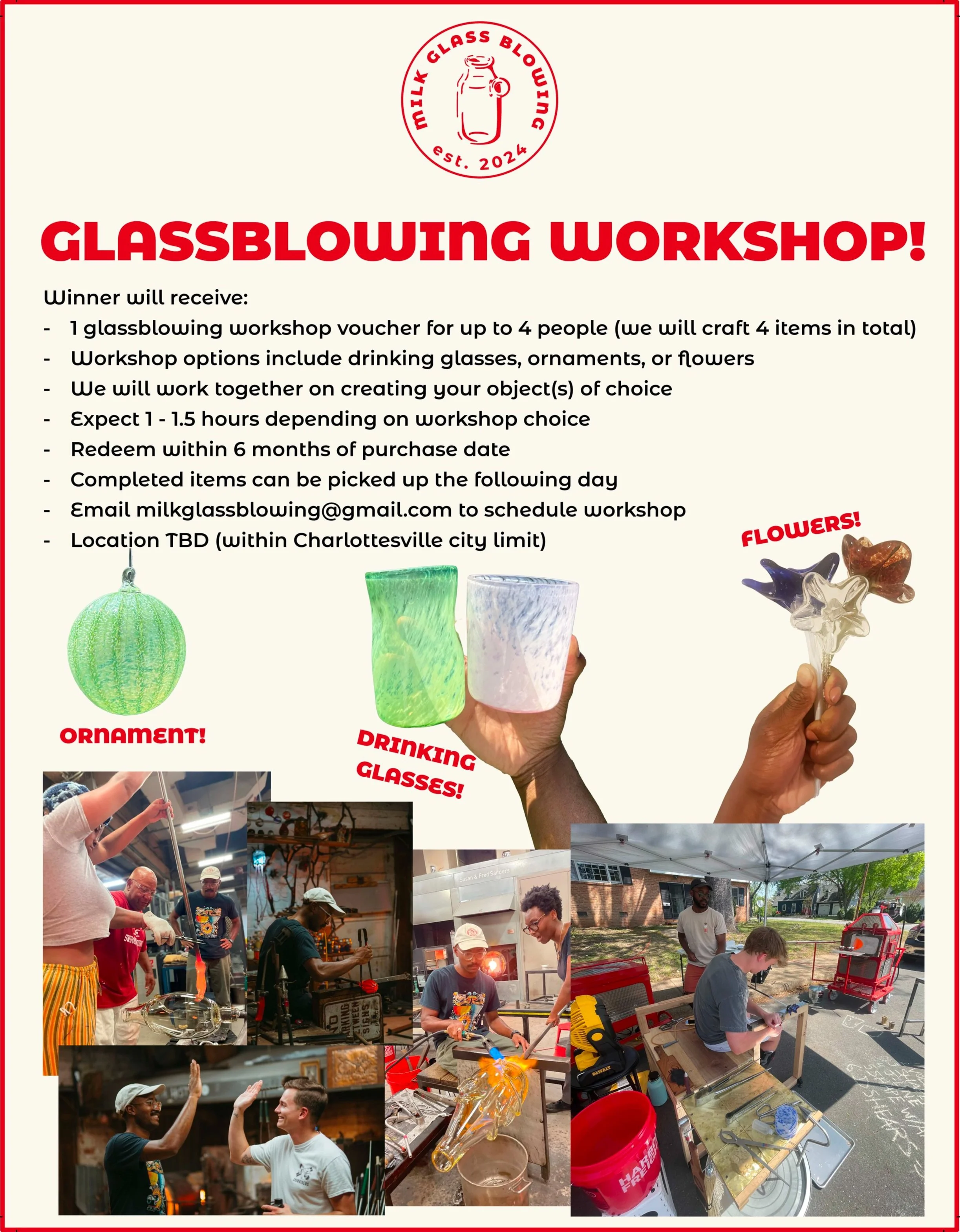 Ceejay Renner-Thomas is a teacher and artist who is making glassblowing more accessible to the Charlottesville community. Originally from Roanoke, VA, he studied Craft & Material Studies at VCUarts before calling Charlottesville home. It’s here that he had developed his passion for craft using contemporary, historic and ancient techniques as they relate to modernity and pop culture. This past February, he received the largest New City Arts SOUP grant to make glassblowing more accessible through his mobile glassblowing studio, Milk Glass.