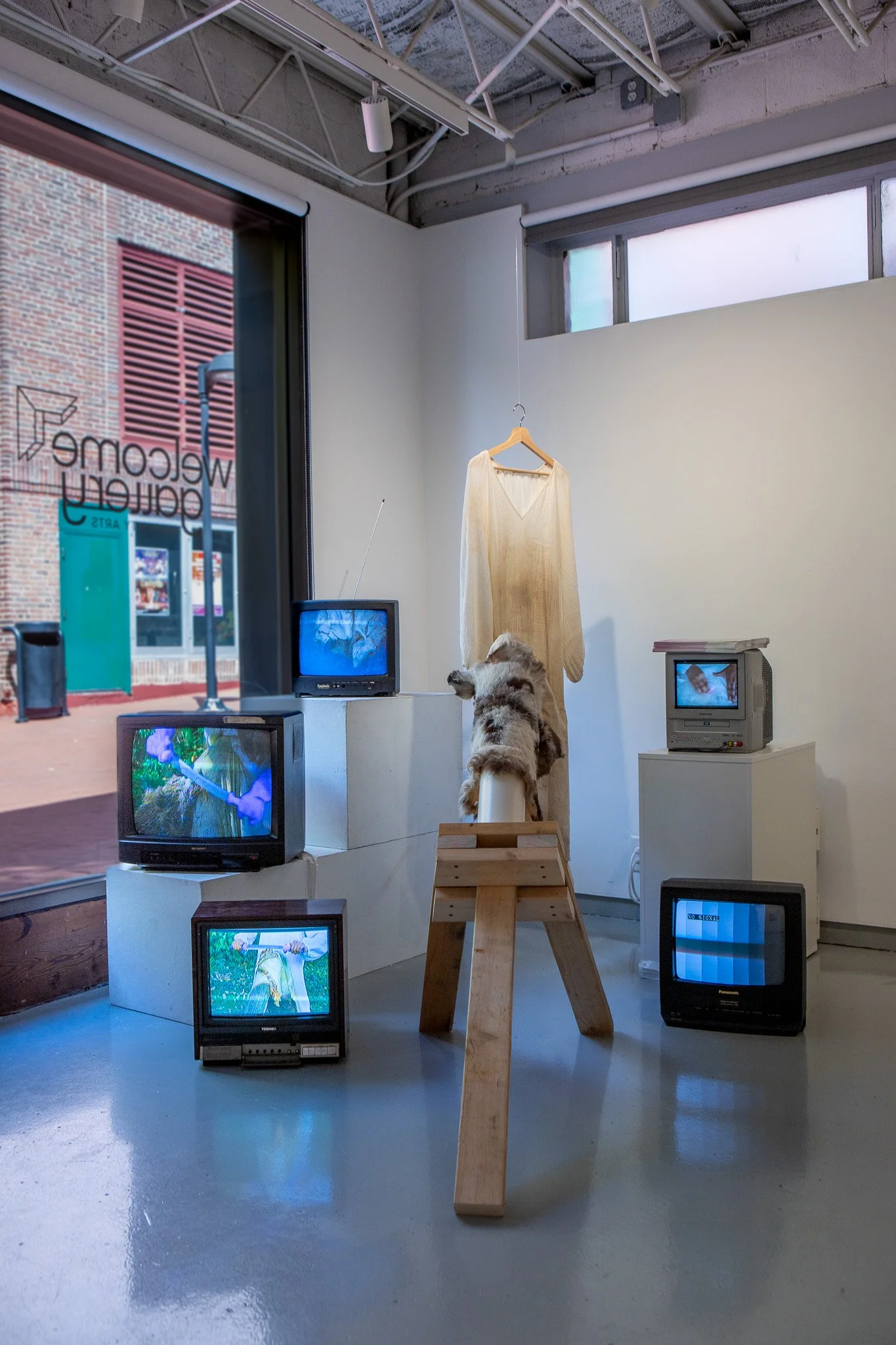 Works by Sophia Chaudhry, Ben Fye, Ava Burke, and I.F. Gonzales are intermingled throughout the gallery space. At the front of the gallery, visitors find an installation by Sophia Chaudhry. A multi-channel film plays on five small, boxy TVs angled at varying heights in the gallery’s front right corner. In the film, Sophia undertakes the process of tanning an animal hide. The white dress Sophia wears in the film hangs from the ceiling in the center of the installation and animal hides are hung on a fleshing beam used during the tanning process. More of Sophia’s work—leather-wrapped door handles and photographs of their installation on doors around Charlottesville—are found on the left and right gallery walls. Along these walls, visitors also encounter Ben Frye’s framed black and white photographs. Displayed in handmade wood frames, the works vary in size and offer a glimpse into some of Charlottesville’s communal spaces—past and present, vacant and thriving. Ava Burke’s winding installation of grease pencil and oil pastel drawings runs through the center of the gallery space, inviting the viewer to meander through them. The drawings, which document a drive around Houston’s 610 Loop, are mounted on linked aluminum plates and suspended from the ceiling. At the back of the gallery’s left side, the drawings loop on the screen of a slide projector positioned on a white pedestal. On the gallery’s partial wall, to the right of the slide projector, hang two works by I.F. Gonzales. On the left, viewers see 2010 Deepwater Horizon Oil Spill footage printed on a partially melted polyester Pride flag. On the right, they see a polyester trans flag with layered watercolor portraits of Jennifer Laude, a transgender Filipina woman who was killed by an active-duty US Marine in 2014. Suspended from the ceiling in front of these works is another flag—comprised of acrylic, pride merchandise, mesh bags, and plastic ephemera covering a California state flag. An altar stands in front of the flag. On it, reproduction of a Molotov cocktail, brick, and water from the Christopher Street Piers are arranged with dried flowers and donated items atop lace draped over a white pedestal. Names sourced from the Remembering Our Dead/Transgender Day of Remembrance project are written on a flag spilling out of the glass bottle. At the foot of the altar, a small red suitcase stands open. Visitors are invited to provide an offering, to be burned after the exhibition’s closing.