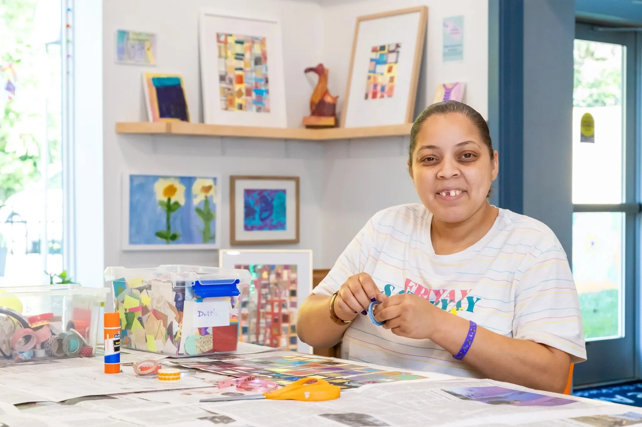 Dottie Swangin (she/her) is a painter and collage artist whose process is driven by material exploration and playful experimentation. Her abstract paintings are made up of dynamic color combinations and her collages layer everyday materials with bright, modern motifs. Dottie works in The Arc Studio daily, incorporating new approaches and ideas into her ever-evolving, always fascinating art.