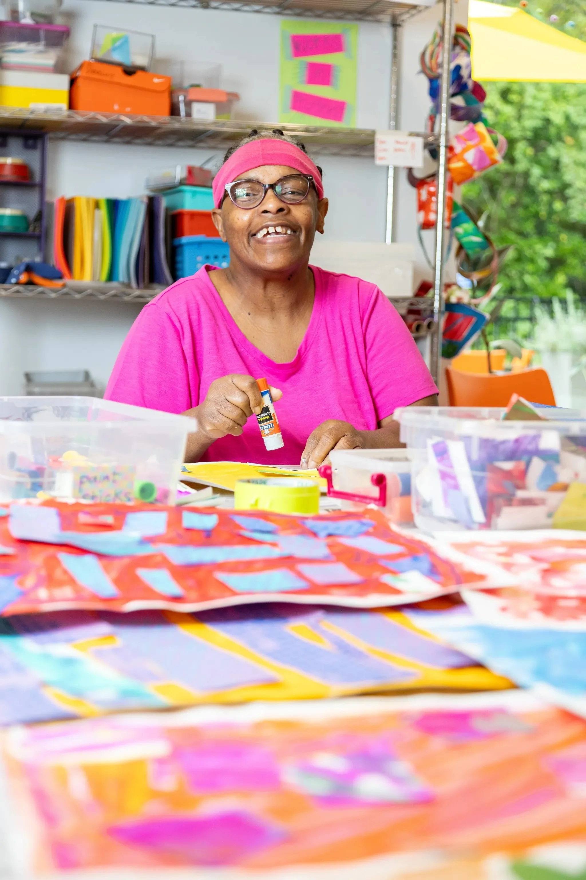 Maude Brown (she/her) applies a direct, physical approach to making art, deploying rapid mark making and energetic movements. Drawn to experimentation, Maude will often include paint, collage, ink, and pastels in one artwork, trying new applications and combinations with each piece. One of The Arc Studio’s most prolific artists, Maude’s bold, expressive paintings hang in homes and businesses throughout Charlottesville.