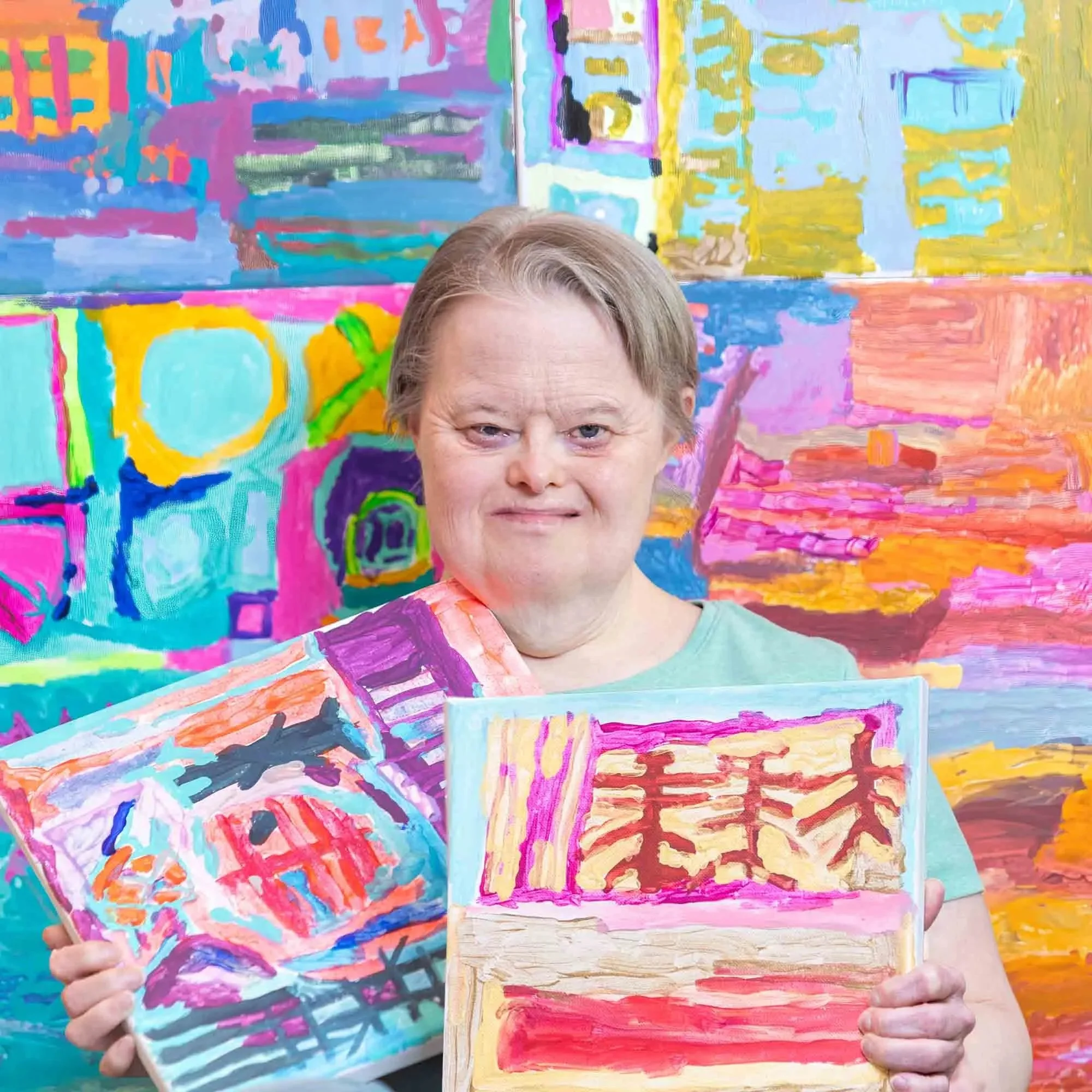 Julia Manley’s (she/her) approach to artmaking is driven by the desire to tell stories. Through her intricate, colorful acrylic paintings, Julia shares stories about her childhood, travel, musicals, romance, and religion. Her vast body of work reflects her vivaciousness, sense of humor, and gregarious spirit. Julia says of her time in The Arc Studio, “When I come into the studio, I get my MOJO running!”